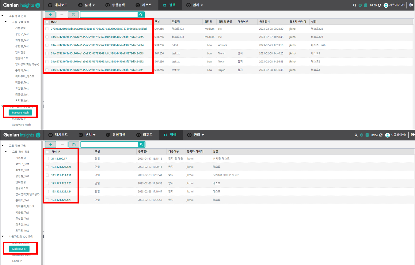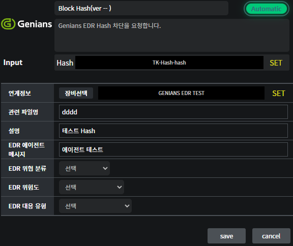 eyeCloudXOAR에서 생성된 Malware Hash 및 Malicious IP를 Genian EDR 정책에 등록/삭제/조회를 연동하여 자동화된 위협 대응을 수행합니다.