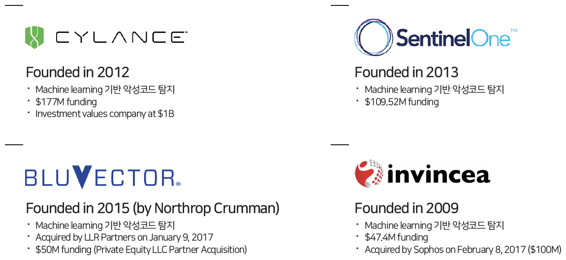 기존의 백신과 단말보안 제품이 제공하는 기능과 효용을 크게 뛰어넘었다는 평가를 받습니다. 시장의 평가도 긍정적 입니다. 투자금과 기업의 가치 평가가 이를 증명해 줍니다. Cylance의 경우 2012에 설립되었지만 무려 1조의 가치를 평가 받습니다.