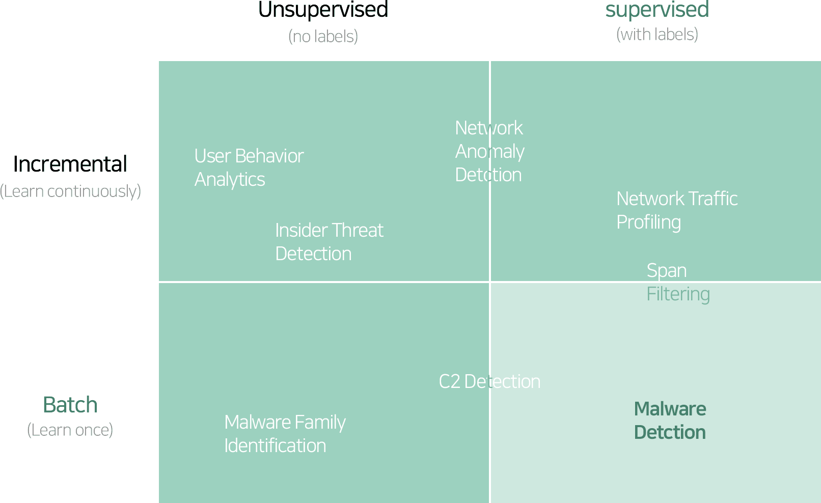 정보보안 분야 역시 머신러닝의 연구 및 적용이 활발하게 이루어 지고 있습니다. 스팸필터링(Spam Filtering)은 지도학습이 적용된 가장 대표적인 사례라고 할 수 있습니다. 이외에도 학습방법과 특징에 따라 사용자행위분석(User Behavior Analytics), 이상행위탐지(Anomaly Detec-tion), 악성코드 탐지(Malware Detection), 인증(행위분석을 통한 개인 식별), 보안관제, 포렌직 등의 광범위한 사이버보안 분야에서 연구 및 적용이 진행되고 있습니다.