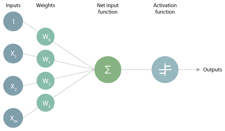 노드는 일정크기 이상의 자극을 받으면 반응을 하는데 그 반응의 크기는 입력 값과 노드의 계수(또는 가중치, Weights)의 곱에 비례 합니다. 일반적으로 노드는 여러 개의 입력을 받으며 입력의 개수만큼 계수를 가지고 있습니다. 따라서 이 계수를 조절하는 것으로 여러 입력에 서로 다른 가중치를 부여할 수 있습니다. 최종적으로 곱한 값들은 모두 더해지고 그 합은 활성함수(Activation Function)의 입력으로 들어가게 됩니다.