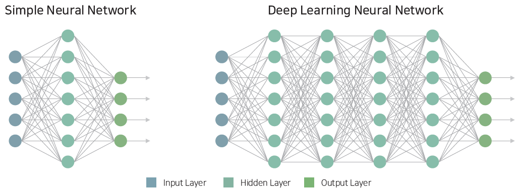 딥러닝은 인공신경망(ANN, Artificial Neural Network)에 기반하여 입력층(Input Layer) 과 출력층(Output Layer) 그리고 다수의 은닉층 (Hidden Layer)의 계층 구조를 가지는 심층신경망(DNN, Deep Neural Networks)을 학습의 주요 방식으로 사용하는 머신러닝의 한 분야 입니 다. 실제 딥러닝의 동작은 선형맞춤(Linear Fitting) 과 비선형변환(Nonlinear Transformation)의 반복이라고 할 수 있습니다. 즉 간단한 학습 구조를 쌓아 올려가며 순차적으로 학습하는 계층적 구조의 학습법이라고 할 수 있습니다.