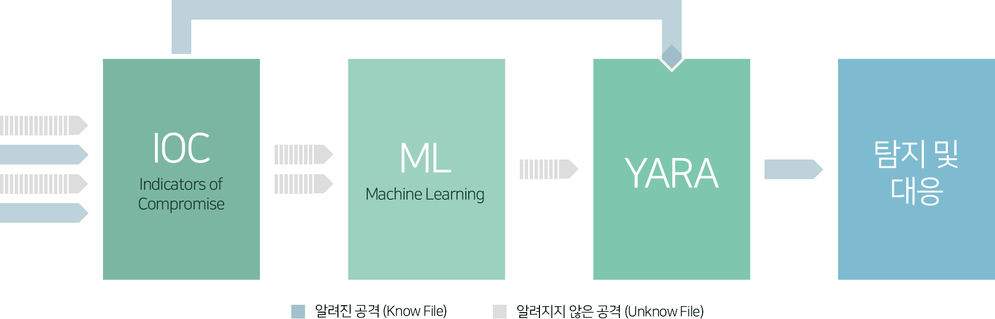 Genian EDR은 지능형 위협을 탐지하기 위해 머신러닝을 포함한 다단계 탐지 방식을 지원하고 있습니다.