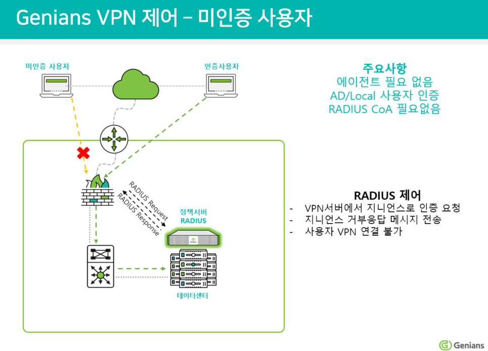 Genian RADIUS서버는 VPN환경에서 인증서버로 사용할 수 있으며 인증 사용자에 대한 제한이 가능합니다.