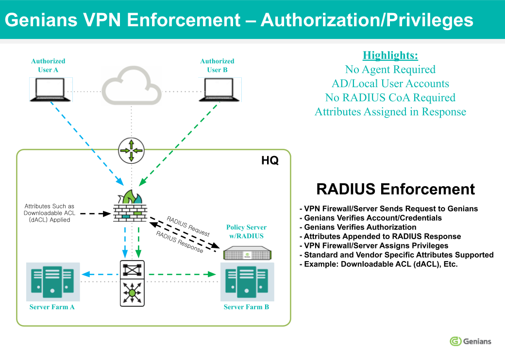 사용자가 Cisco ASA (또는 유사한 솔루션)를 VPN 게이트웨이로 사용하여 네트워크에 접속하는 경우, Genian NAC의 RADIUS 서버를 사용하여 dACL(Dynamic ACL)을 적용하고 다양한 네트워크 리소스에 대한 역할 기반 액세스 제어를 수행할 수 있습니다.