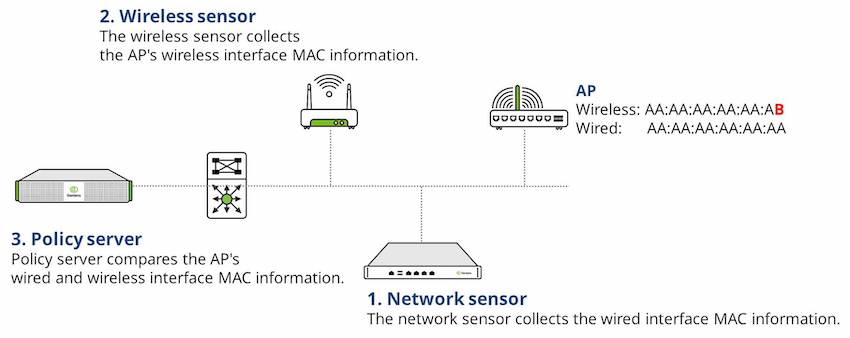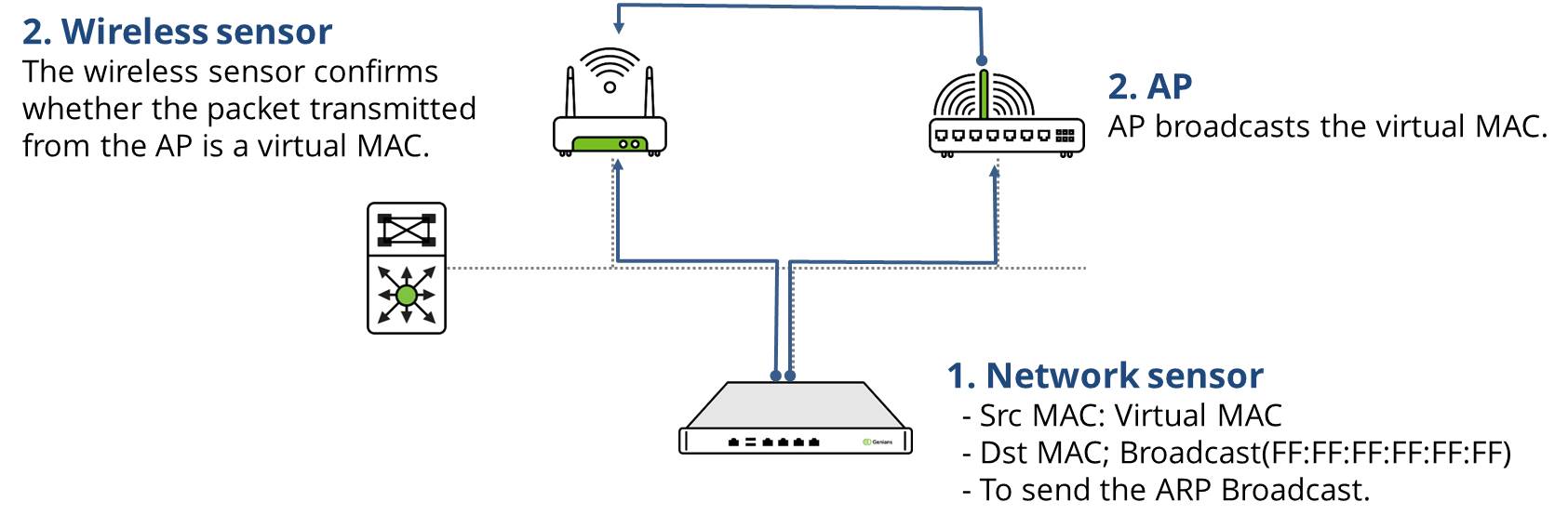 무선센서는 무선 네트워크를 모니터링하고 무선 센서가 AP로부터 가상 MAC을 수신하면 AP를 내부 AP로 판단합니다.