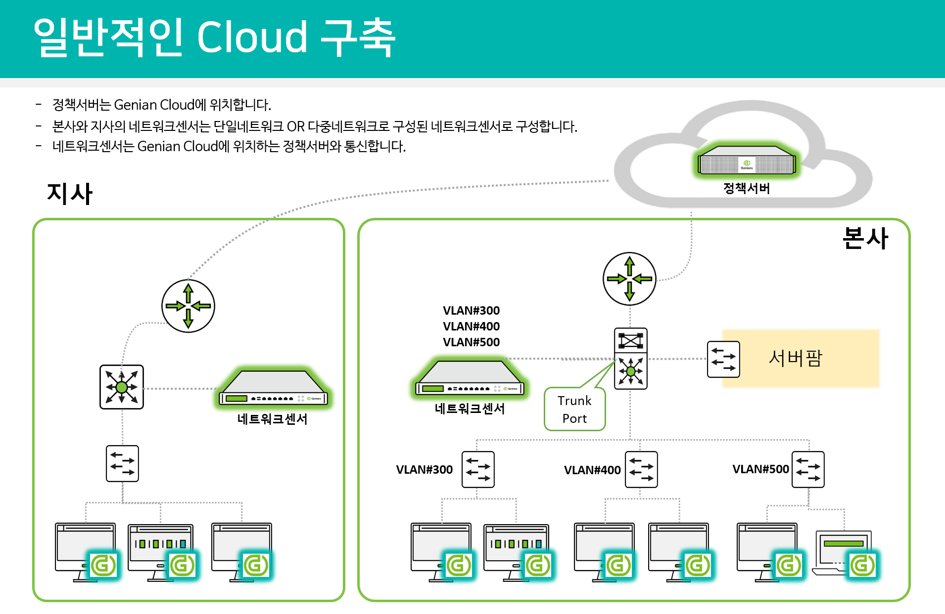 정책서버 는 클라우드에 설치가 되며 네트워크센서 는 원격 사이트 위치의 Edge Switch에 연결하여 설치 할 수 있습니다. Edge Switch 포트는 엑세스 포트이거나 최대 128개(권장 64개)의 VLAN을위한 트렁킹 포트 일 수 있습니다. 네트워크센서에 128 개 이상의 VLAN이있는 경우 두 번째 네트워크센서 가 필요합니다.