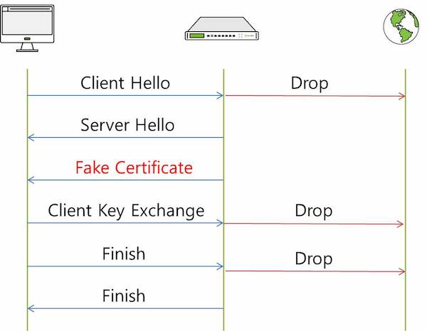 Genian ZTNA가 HTTPS 통신을 하려는 PC에 CWP 페이지를 표시하는 방법입니다. 차단된 단말이 WEB 브라우저로 통신을 시도할때 GENIAN ZTNA CWP 페이지가 표시되는 원리를 이해할 수 있습니다.