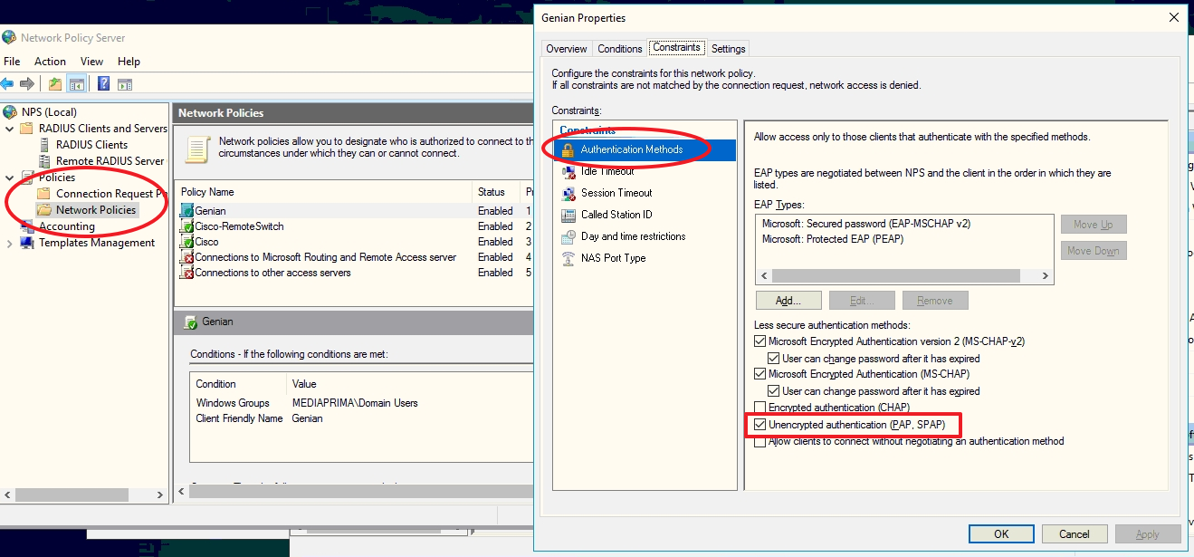RADIUS서버에서 비암호화 방식의 인증요청도 허용하도록 설정