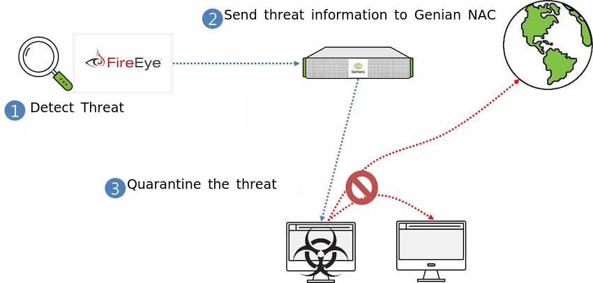 When a specific anomaly is detected by FireEye, FireEye sends anomaly information detected to Genian NAC through SYSLOG Genian NAC will be able to prevent the spread of anomalies by quarantine the anomaly target.