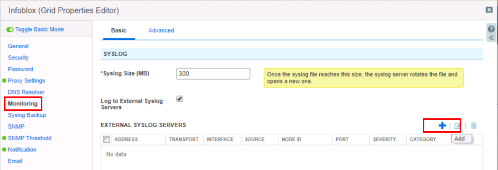 Click on Monitoring and then click the + button to add a new Syslog server.