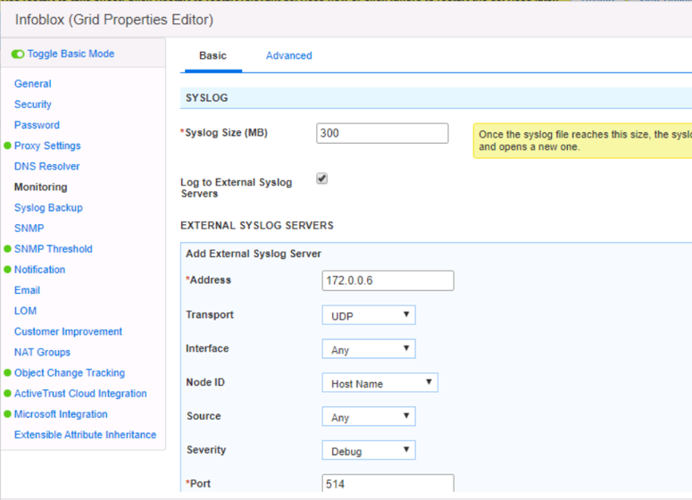 Enter the IP of the Genian ZTNA Policy Server, select UDP, Any for Interface, Host Name for Node ID, Any for Source, Debug for Severity and 514 for Port. Restart service in Infoblox DDI if prompted.