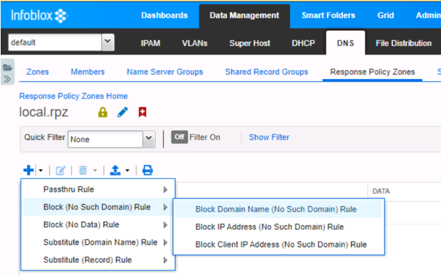 Navigate to Data Management > DNS > Response Policy Zones > local.rpz