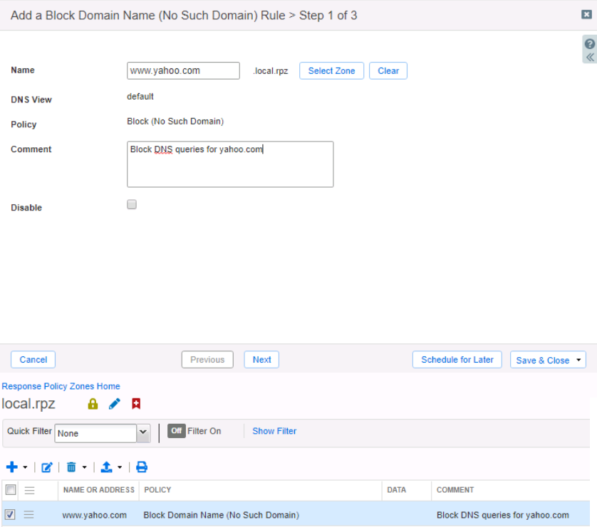 Enter a test domain name. In this example www.yahoo.com was used to simulate to simulate a Domain Name that is associated with a Malware Threat. Enter the Domain Name and a comment and then click Save & Close. No need to complete steps 2 and 3 in Infoblox.