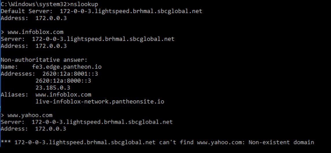 On a test machine subject to the previously configured Response Policy Zone, perform an nslookup on authorized domain (infoblox.com) and then perform an nslookup on unauthorized domain simulating malware site (www.yahoo.com).