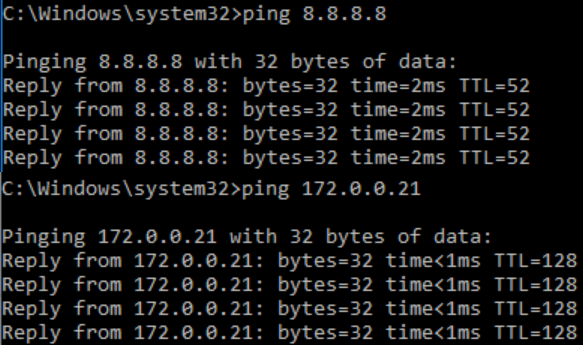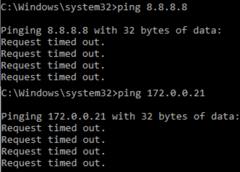 On the test machine, generate continuous pings to both an internal and external host. Note that even though Infoblox DDI has denied the domain from being resolved, the device still has network access, both to external and internal hosts: