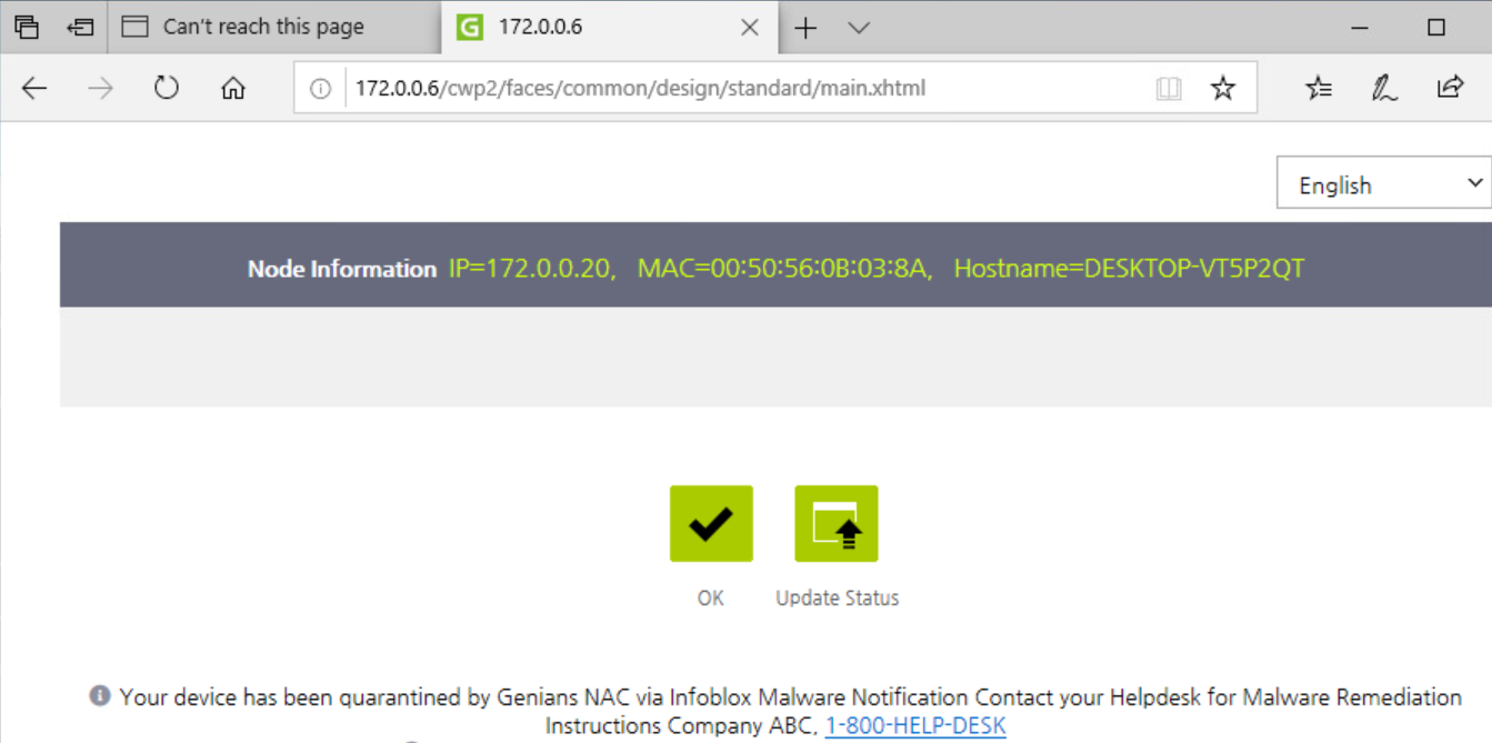 In the browser of the test machine, navigate to Infoblox.com and the Genians Captive Portal will be displayed with your message. Both the page design and contents may be customized, this is just a generic template.