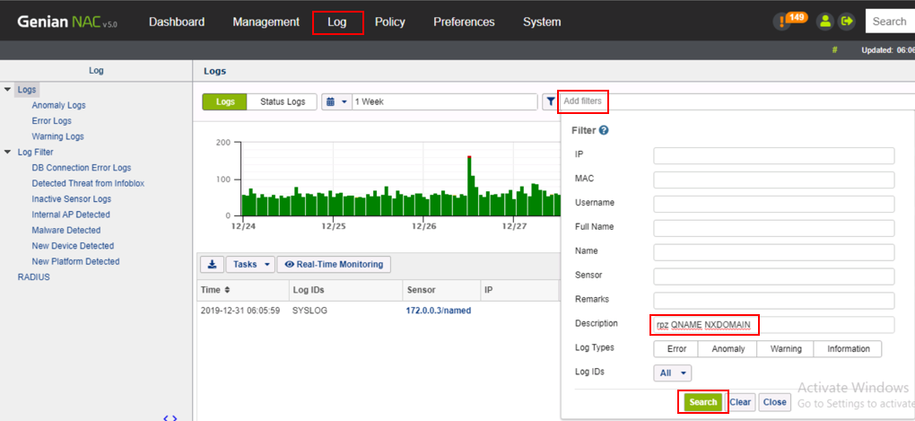 Click on Log and then Add filters. Critical RPZ syslog alerts from Infoblox DDI include the key words “rpz QNAME NXDOMAIN”. Type these words into the Description field of the log filter and click Search.