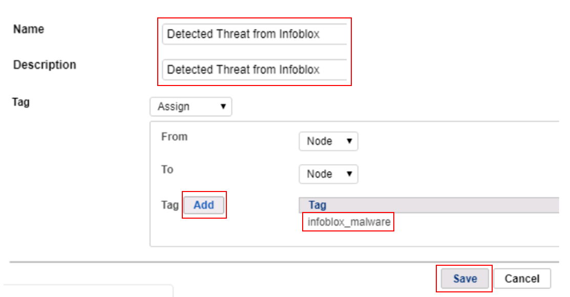 Give the log filter a name, description and add the previously created “Infoblox_malware” tag then click Save. In this example, we will apply the tag to the node (MAC+IP), though log filters can also apply tags to MACs, Users, or WLANs.