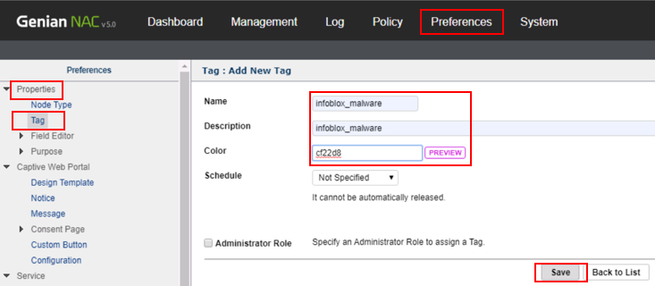 Navigate to Preferences > Properties > Tag and create a tag called “infoblox_malware” then click Save. This tag will be linked to a log filter and eventually to an Enforcement Policy in future steps.