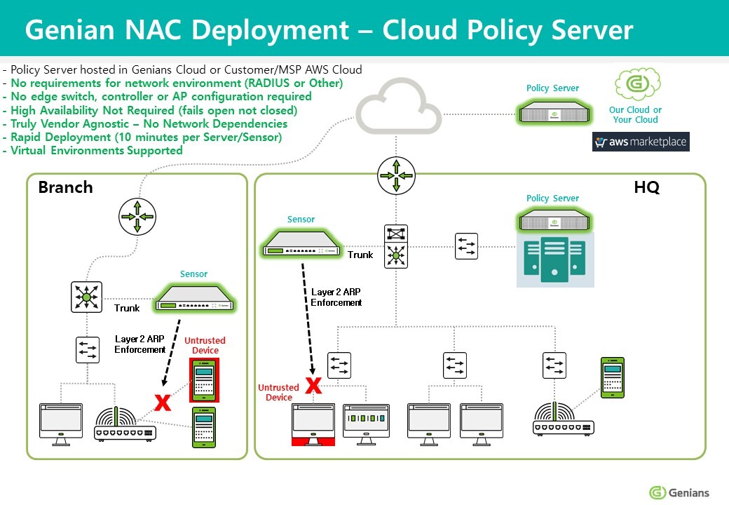 To address these complexity and compatibility issues, Genians offers a method of securing visibility through an independent Network Sensor. The network sensor is connected to each subnet (broadcast domain) and can be deployed without changing the existing network environment. Usually, installation and full visibility can be acheived in under three days.