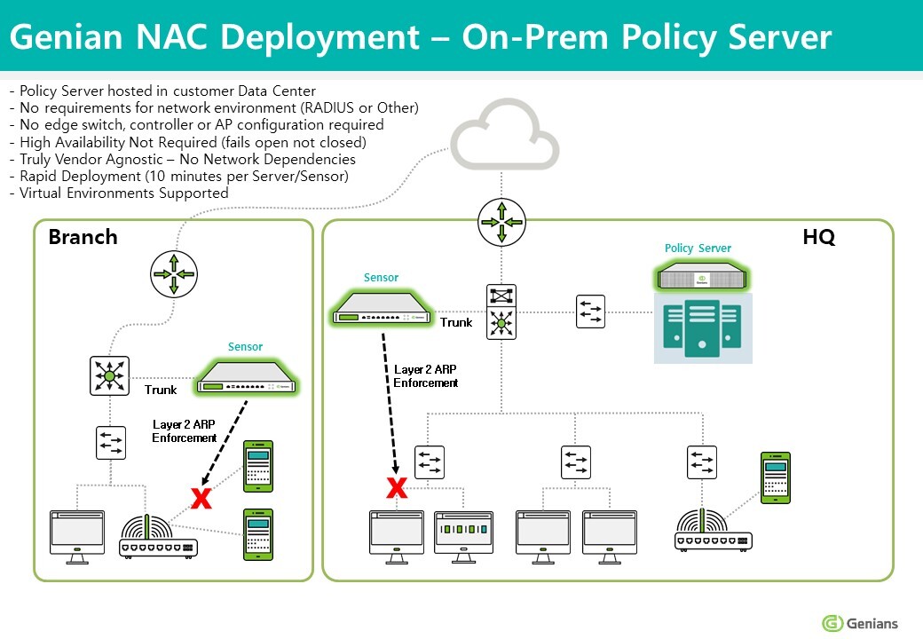 To address these complexity and compatibility issues, Genians offers a method of securing visibility through an independent Network Sensor. The network sensor is connected to each subnet (broadcast domain) and can be deployed without changing the existing network environment. Usually, installation and full visibility can be acheived in under three days.